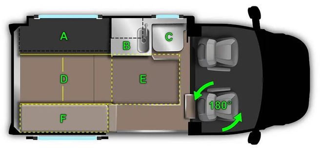 生活区内部由厨房区、卫浴间、车尾会客区、拼床组成。副驾驶座椅支持180度向后旋转,驻车休息时便于车内乘客交流。