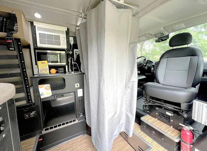 厨卫区设计在驾驶室后方,马桶通过硬板隐藏在内部,生活区中间位置设计了下沉式区域,用户可以通过厨房水龙头的淋浴花洒进行淋浴,同时上方浴帘还能保护用户隐私。