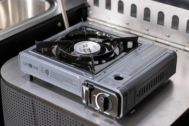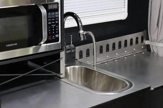 厨房区采用不锈钢材质,台面包括洗手池、操作台以及便携式卡式炉等,台面下方还配有一台76L冰箱可以存放旅居食材。