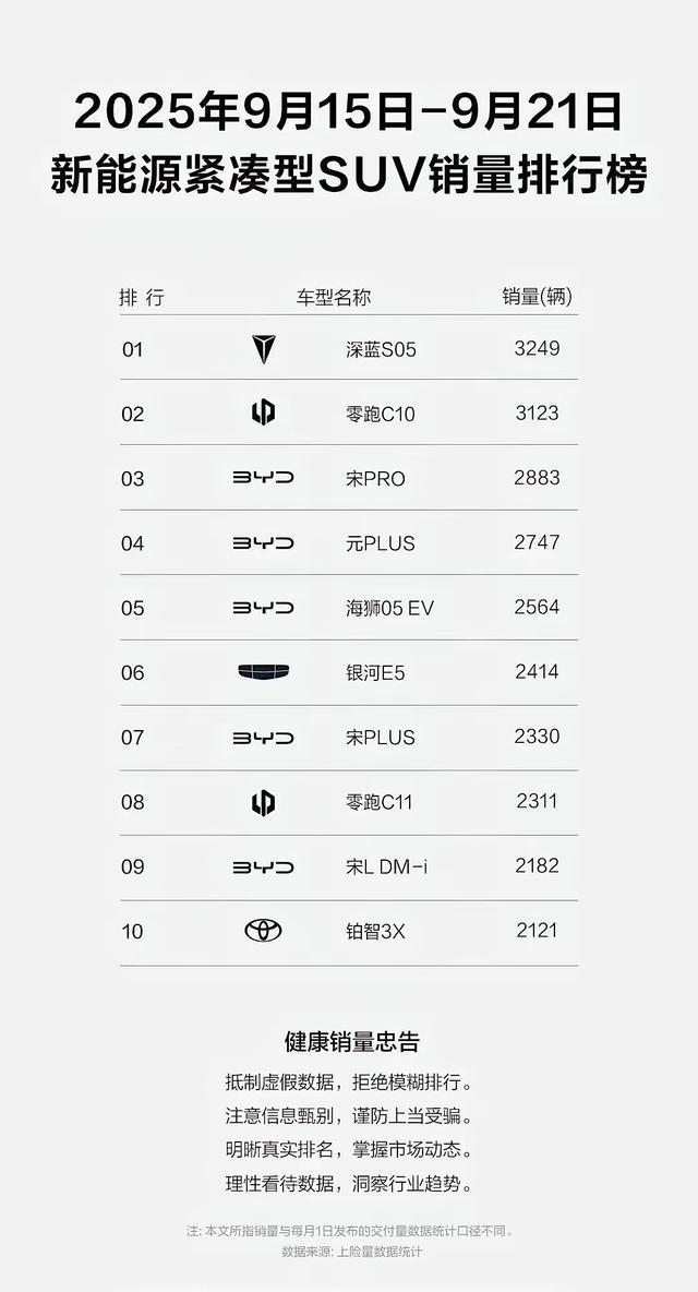 汽车销量榜,也算是大家茶余饭后的聊点,也可能对选车购车形成参考。每周的销量,有车企品牌榜,有大型SUV榜,有MPV榜,但紧凑型SUV榜单见得比较少。对于新能源紧凑型SUV,我知道有几款,如银河E5,深蓝S05,元plus等等,今天的这个榜单,我才知道TOP10的这些车型,都是紧凑型SUV。接下来就详细说说。